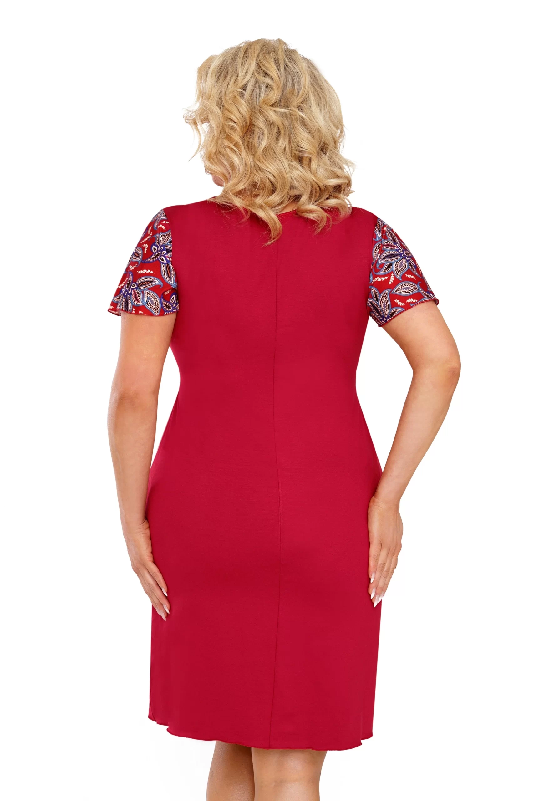 Experimentează un amestec perfect de stil și confort cu cămașa de noapte RITA PLUS, meticulos fabricată în Uniunea Europeană. Designul său plin de caracter include un decolteu moderat decorat cu dantelă atrăgătoare, ce captează privirea. Mânecile fluide, finalizate cu falbene, adaugă feminitate, iar culoarea bordo intensă, accesorizată cu detalii în nuanțe de albastru, completează un look vibrant și sofisticat.