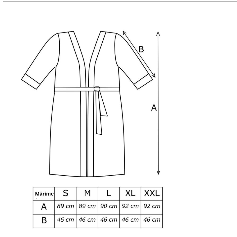 Tivul halatului și marginile mânecilor sunt finisate cu o bandă lată de material neted, adăugând un plus de rafinament și eleganță acestui halat de baie. Detaliile atent realizate fac din halatul ROSA o piesă deosebită, ideală pentru femeile care apreciază calitatea și stilul.