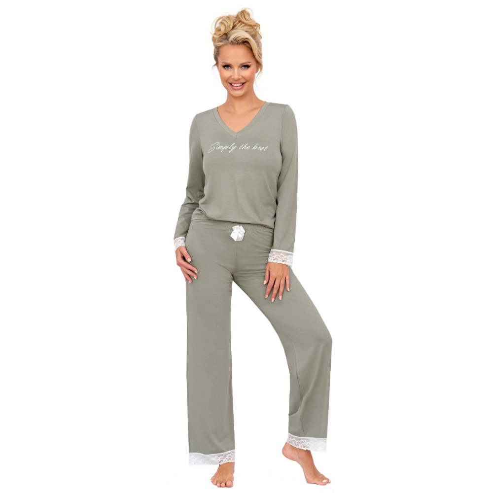 Fabricate în Uniunea Europeană, pijamalele premium SIMPLY sunt realizate din vâscoză moale și elastică, pentru un confort maxim. Bluza este decorată cu un imprimeu delicat, având un decolteu în „V” și mâneci lungi, terminate cu dantelă fină. Pantalonii lungi, cu croială lejeră și lărgită, sunt de asemenea finisați cu dantelă, iar talia este accesorizată cu o fundiță decorativă în culoarea ecru.