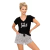 Cămașa ecru decorată cu inimioare roz adaugă un strop de prospețime și veselie garderobei tale de noapte. Decolteul în formă de V și mânecile clasice oferă un aspect rafinat și feminin. Pantalonii scurți roz, simpli, sunt terminați cu un tiv decorat cu volane, aducând un plus de libertate de mișcare și un look jucăuș.